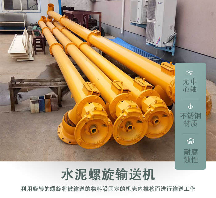 水泥螺旋输送机该机主要用于物料的输送,粉煤灰物料、造纸物料、污泥等,还适用于化工、冶金、粮仓加工、仓储及其它适用螺旋输送机的场所,该机螺旋体直径小,转速高,输送量大,精度高,输送工况佳。