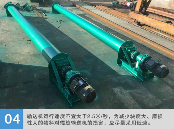 输送机运行速度不宜大于2.5米/秒,为减少块度大、磨损性大的物料对螺旋输送机的损害,应尽量采用低速。